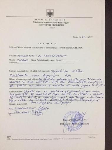 Një ditë pas tërmetit në këtë godinë është bërë një inspektim nga Instituti i Ndërtimit, të cilët kanë kërkuar riparimin e mureve, pasi nëse do të ketë lëkundje të tjera mund të ketë zhvendosje.