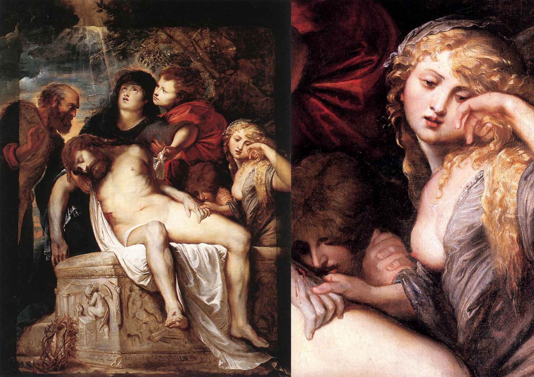 Peter Paul Rubens e ka jetësuar në një mënyrë kaq domethënëse dhe e përplotësuar me të gjithë ansamblin e debatueshëm të mjegullës dyshuese dhe të vërtetës së strukur poshtë cohës së hollë të ndalimit që mbulon atë. Duke e shtjelluar detajimin e këtij komunikimi, alegorisë dhe shprehis, atë çfarë Ruben guxon të përcjellë, përkundër çdo sanksionimi dhe privimi i kanuneve kishtare, Maria Magdalena zë një vend të konsiderueshëm në këtë tablo. Por jo vetëm aq. Trajtesa erotike e personazhit që simbolizon Maria Magdalenën, është thellësia e njerëzores që përmes joshjes sjell femrën, përmes pikëllimit demonstron dhimbjen. Flokët e saj të artë e të pëdredhuar, gjoksi i kolmë e portreti i rrezellitur nën të njëjten dritë të hyjshme që bie, duke larë Jezusin të tërin dhe Magdalenën gjithashtu, ndërsa personazhet e tjera u prek vetëm fytyrën, tregon rëndësinë që Rubens i dedikon kësaj gruaje, që përmes elementeve shprehës artistik vjen po kaq e hyjat sa vetë hyjnia e Jezusit dhe zbritjes nga kryqi.