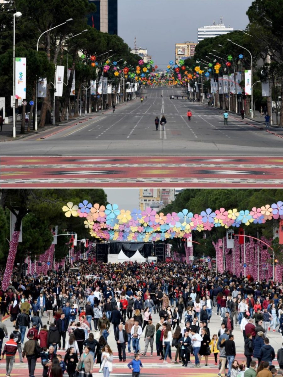 Kjo e shtunë që përkon me Ditën e Verës. Të vetëizoluar për të frenuar përhapjen e koronavirusit të ri, Covid-19, pak qytetarë kishin dalë në rrugët kryesore të Tiranës, gjithsesi të zbukuruar. Edhe ata që zgjodhën të shëtisnin apo stërviteshin te Liqeni Artificial, e ndërprenë aktivitetin pas vendimit për ta mbyllur parkun për shkak të mbipopullimit në ditët e kaluara. Të mbyllur në shtëpi njerëzit kanë “dalë” në ballkonet e apartamenteve të tyre, prej nga kanë shijuar rrezet e diellit dhe sigurisht, kanë fotografuar zbrazëtinë e qytetit.