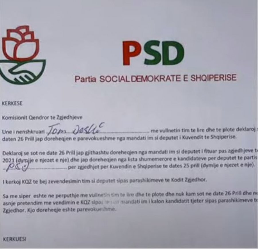 Mbrëmë vonë Kryetari i PSD, Tom Doshi, dha dorëheqje të parevokueshme nga kandidimi i tij për deputet, dhe i kërkoi KQZ-së që ta zëvendësojë me emrat e tjerë.