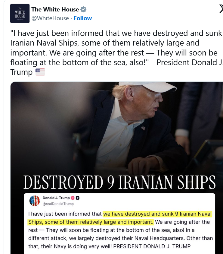 Presidenti i Shteteve të Bashkuara, Donald Trump, tha se SHBA-ja ka shkatërruar nëntë anije të marinës iraniane dhe se ka shkatërruar pjesërisht selinë kryesore të marinës së Iranit.