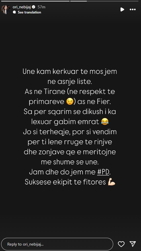 ”Unë kam kërkuar të mos jem në asnjë listë. As në Tiranë (në respekt të primareve) as në Fier. Sa për sqarim se dikush i ka lexuar gabim emrat. Jo si tërheqje, por si vendim për t’i lënë rrugë të rinjve dhe zonjave që e meritojnë më shumë se unë”, shkruan Nebiaj.