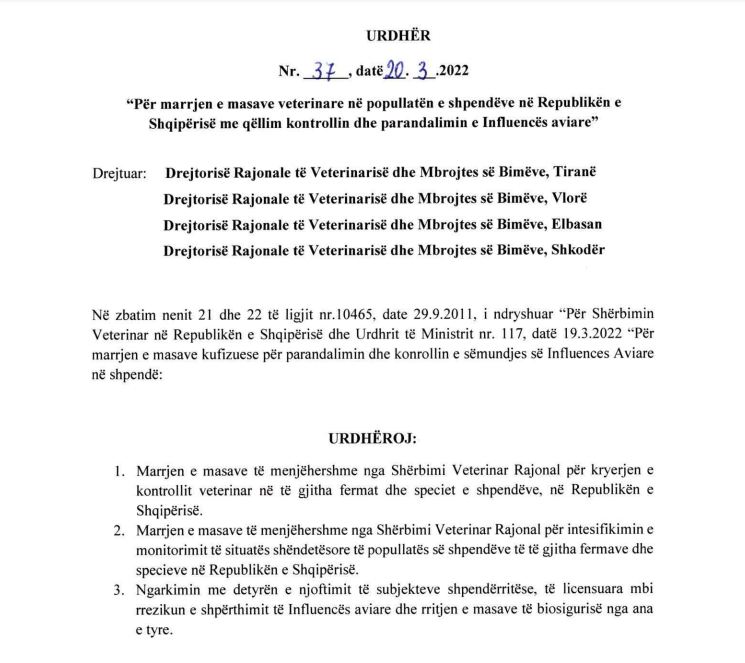 Ministria e Bujqësisë njoftoi konfirmimin e rastit të parë me virusin H5N8, i njohur si gripi i shpendëve. Me anë të një reagimi, urdhëron marrjen e masave nga Shërbimi Veterinar Rajonal për kryerjen e kontrollit veterinary në të gjitha fermat dhe speciet e shpendëve.