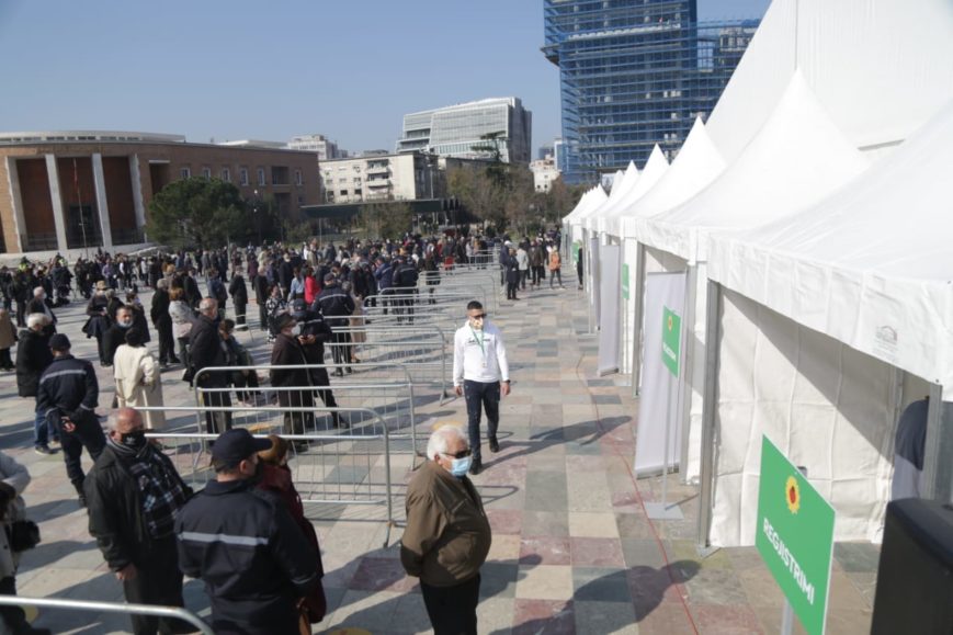 Mëngjesin e kësaj të diele në Tiranë nisi edhe vaksinimi masiv kundër koronavirusit. Dy çadra të mëdha janë ngritur në sheshin kryesor të kryeqytetit, kjo për të vaksinuar të moshuarit e njoftuar më herët nga mjekët e familjes. Ministria e Shëndetësisë dhe e Mbrojtes Sociale, bëri me dije se planifikon të vaksinojë mbi 10 mijë persona në ditë kundër Covid-19. Siç shihet edhe në fotot e mëposhtme, ka grumbullime dhe të moshuarit po presim radhën në këmbë për të marrë dozën e parë të vaksinës.