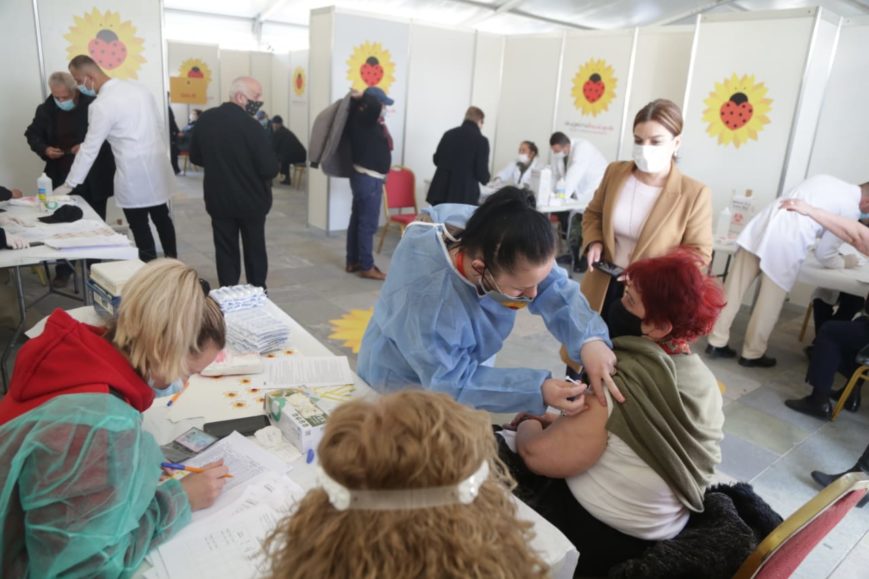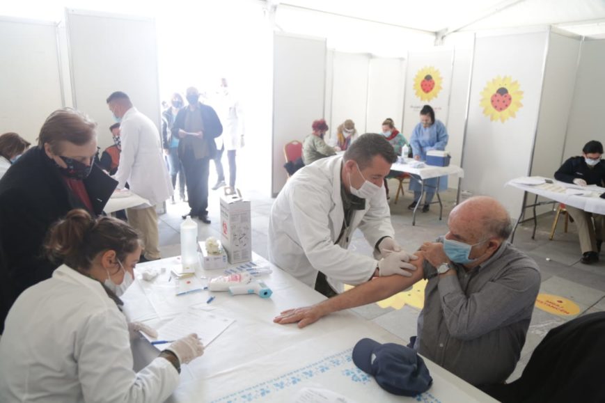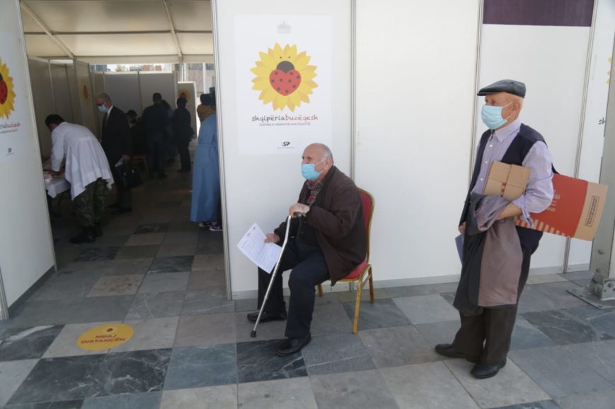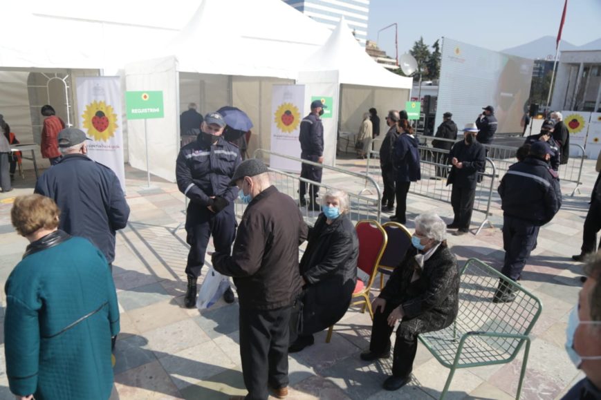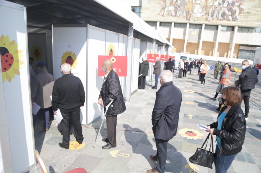 Ministria e Shëndetësisë ka ngritur një çadër të madhe në qendër të kryeqytetit për të mundësuar vaksinimin e të moshuarve me vaksinën ndaj Covid-19 që ka shkaktuar mijëra viktima në mbarë botën. Të moshuarit mbi 75 vjeç, sot morën dozën marrin dozën e vaksinës kineze të Sinovac. Procesi i vaksinimit do të vijojë dhe në qytete të tjera të Shqipërisë, të cilat po ashtu janë furnizuar gjatë ditëve të fundit me këtë vaksinë.