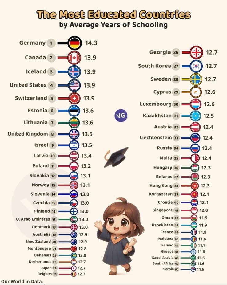 Themeli i vërtetë i suksesit qëndron në inteligjencën e popullit të tij. Në botën e sotme, arsimi është monedha më e vlefshme që një vend mund të zotërojë. Sipas një liste që Saimir Kadiu ka publikuar, shihet që Gjermania mban vendin e parë në botë, për shtetin më të edukuar. Por nga ana tjetër, prej vitesh ky vend është përballuar me mungesë të forcës profesioniste në fushën e mjekësisë. Në këtë listë Shqipëria nuk bën pjesë, dhe është një alarm sesi një vend i vogël nuk bën pjesë në listën me vendet më të shkolluara. Miti që të rinjtë qëndrojnë në kafene nuk është i gabuar.