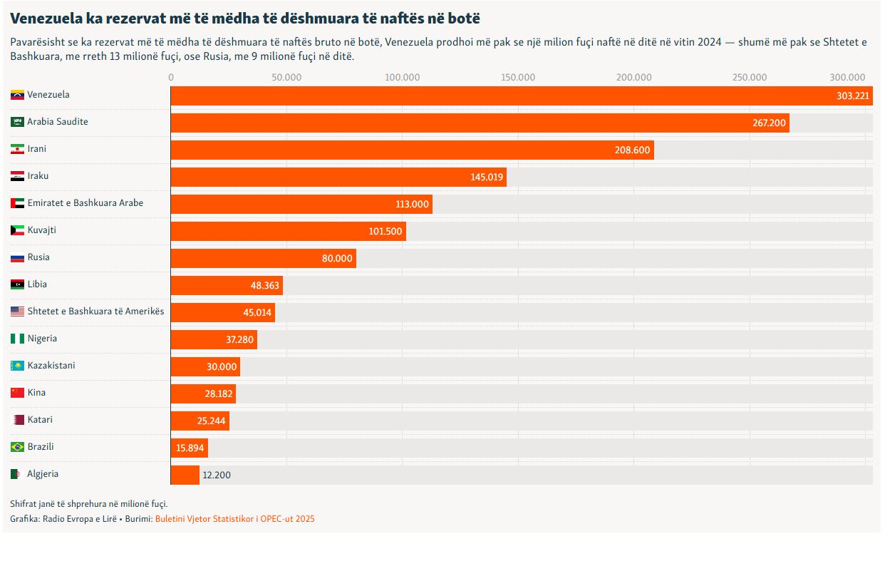 Pavarësisht se ka rezervat më të mëdha të dëshmuara të naftës bruto në botë, Venezuela prodhoi më pak se një milion fuçi naftë në ditë në vitin 2024 — shumë më pak se Shtetet e Bashkuara, me rreth 13 milionë fuçi, ose Rusia, me 9 milionë fuçi në ditë.