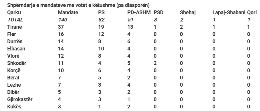 Shumë pritmëri e shumë debate ka patur për votat e diasporës, por 145 mijë prej tyre të numëruara deri tani, vetëm për 1 mandat kanë ndikuar – në Qarkun Vlorë. Në tabelën e mëposhtme mund të shihni sesi do të ishin ndarë mandatet pa votat e diasporës – pra vetëm me votat e zgjedhësve të këtushëm. Aty shihet se në këtë rast, PS-ja do të kishte 82 mandate, PD-ASHM 51, PSD 3, Lapaj-Shabani 1, Shehaj 2 dhe Qori 1.