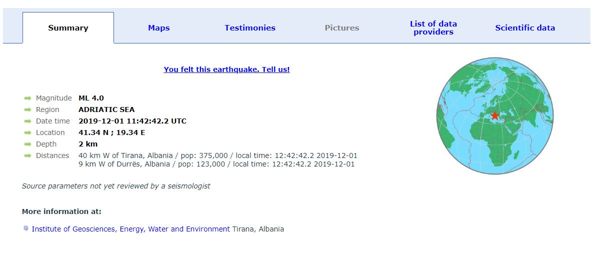Kjo lëkundja ka qenë me magnitudë 4.0 të shkallës rihter. Thellësia e këtij tërmeti ka qenë 2 km. Kjo lëkundje është ndjerë në disa qytete përfshirë edhe Tiranën.
