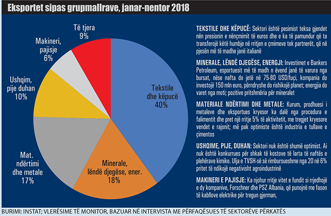 Eksportet e tekstileve e këpucëve, që zënë peshën kryesore, me 40% të totalit, u zgjeruan me 6.2% për 11-mujorin 2018, nga 10% vitin e mëparshëm, të prekura nga zhvlerësimi i euros. Ky sektor, që punon me sistemin e materialit të porositësit dhe bën vetëm disa procese (kryesisht qepje-hekurosje), është më pesimist këtë vit, pesimist teksa gjendet nën presionin e nënçmimit të euros dhe e ka të pamundur që ta transferojë këtë humbje në rritjen e çmimeve te partnerët, që në pjesën më të madhe janë italianë.