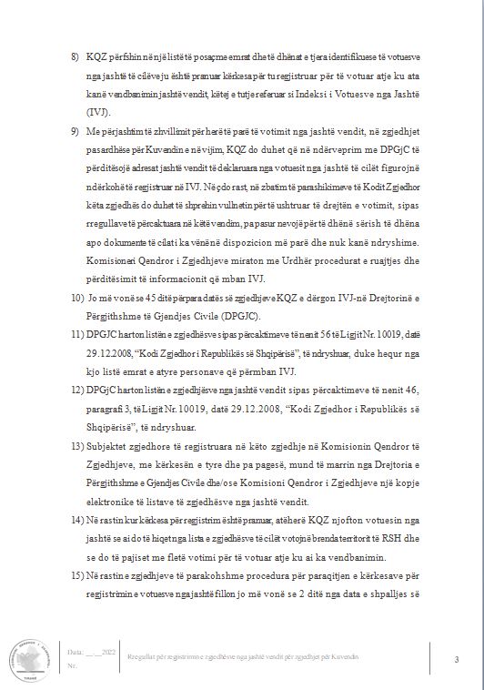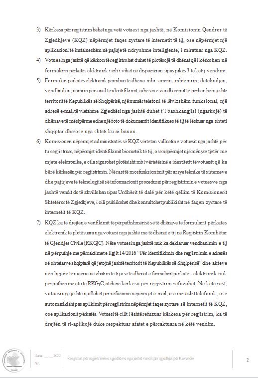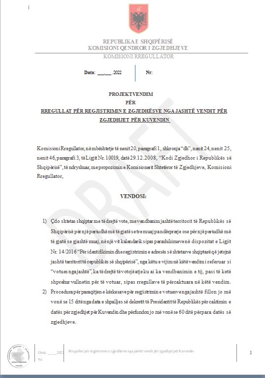 Është zbardhur propozimi i Komisionit Qendror të Zgjedhjeve, në të cilën thuhet se çdo emigrant duhet të paraqesë kërkesë që do të marrë pjesë në votim, jo më vonë se 15 ditë që nga shpallja e datës së zgjedhjeve nga ana e kreut të Shtetit. Kjo kërkesë do të bëhet në Komisionin Qendror të Zgjedhjeve në faqen e internetit ose edhe nëpërmjet aplikacionit zyrtar të KQZ-së. Sipas propozimit, emigrantit do t’i duhet të plotësojë një formular me të dhënat e tij personale, gjeneralitetet si edhe një foto të dokumentit identifikues, mund të jetë ai shqiptar, por edhe të shtetit ku ai banon. Duhet theksuar se nëse votuesi nga jashtë nuk ka deklaruar vendbanimin, atëherë kërkesa nuk do të jetë e vlefshme.