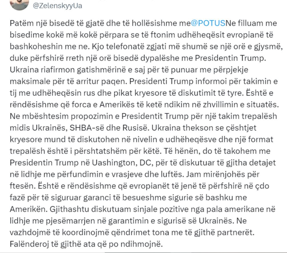 Në një deklaratë me shkrim, Zelensky thotë se bisedoi me presidentin Trump për rreth një orë.
