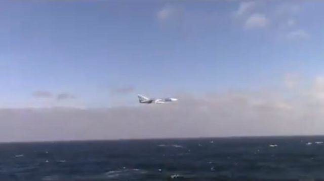 Një avion rus Su-24 u pa duke iu afruar anijeve detare, në imazhin e shpërndarë nga SHBA në llogarinë Twitter të Forcave të Marinës Evropiane.