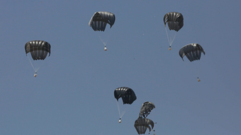 Fluturimet e para nga ajri që shpërndanë ndihmën shumë të nevojshme u kryen nga Jordania dhe Emiratet e Bashkuara Arabe.