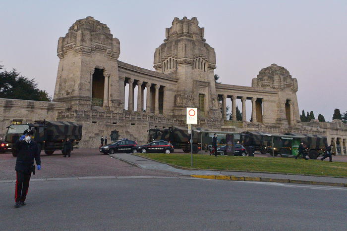 - Intervento dell’esercito al cimitero monumentale di Bergamo per smaltire le bare dei deceduti di coronavirus in altro forno crematorio, 18 marzo 2020. ANSA/FILIPPO VENEZIA
