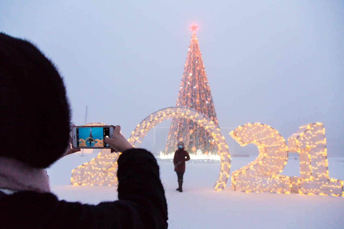 Gratë sfidojnë temperaturat e ngrirjes për të bërë selfie në Sheshin Lenin. Temperatura më e ulët e regjistruar në Yakutsk ishte -64.4 gradë Celcius, në shkurt 1891.