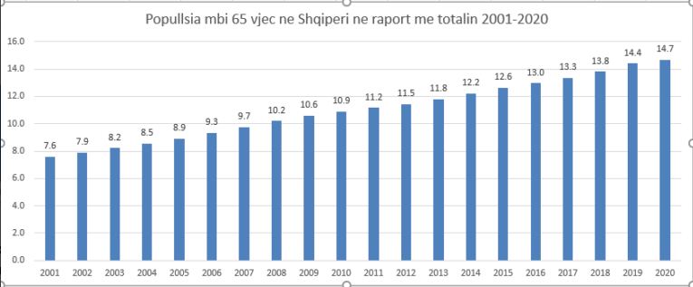 Në raport me një vit më parë të plakurit e Shqipërisë u shtuan me 0,3 pikë përqindje, ndërsa në raport me një dekadë më parë kjo grupmoshë u rrite 4 pikë %. Në vitin 2001 popullsia mbi 65 vjeç në Shqipëri përbente vetëm 7.6 % të totalit të popullsisë.