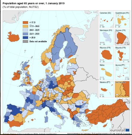 Në të gjithë shtetet anëtare të BE-së, pjesa më e madhe e moshuarve në raport me popullsinë e përgjithshme në vitin 2019 u vërejt në Itali (22.8%), e ndjekur nga Greqia (22.0%), Portugalia dhe Finlanda (21.8% secila), Gjermania (21.5%) dhe Bullgaria (21.3%).