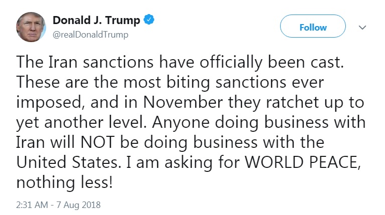Presidenti i SHBA Donald Trump ka bërë një paralajmërim të fortë për të gjithë partnerët tregtarë që bëjnë biznes me Iranin, pas ri-vendosjes së sanksioneve ndaj këtij shteti. “Kushdo që bën biznes me Iranin nuk do të bëjë me Shtetet e Bashkuara”, -shkroi presidenti Trump në Twitter. Sanksionet kanë në shënjestër sektorë të ndryshëm me masa të tjera ndëshkuese të planifikuara edhe mbi industrinë e naftës të vendit. Presidenti Trump nënshkroi dje urdhrin ekzekutiv që riktheu sanksionet menjëherë pas mesnate, ndërsa një seri e dytë sanksionesh do të hyjnë në fuqi më 5 nëntor.