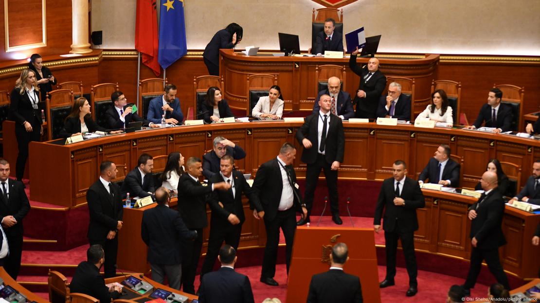 Pamje nga seanca e parë të parlamentit të ri të Shqipërisë, më 18 shtator, kur sallën e mbuluan britmat, goditjet e tavolinave dhe thirrjet e opozitës, pasiKryeministri Edi Rama prezantoi Ministren për Inteligjencën Artificiale.Fotografi: Olsi Shehu/Anadolu/picture alliance
