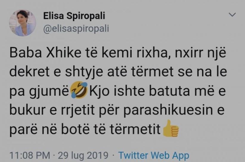 Por çfarë ndodhi me ngritjen e këtij shqetësimi? Ashtu si çdo problem të madh, Rama e pa me syrin e një kllouni. Meqë ishe koha e sherrit për dekretimin e zgjedhjeve të 30 qershorit ai tha në një intervistë: “Meta e ka kollaj, nxjerr një dekret dhe e anullon tërmetin”. Në disa fjalime me radhë ai e trajtoi presidentin si një të luajtur mendsh, ashtu sikurse ia donte politika e ditës. Edhe me larg shkoi si gjithmonë Elisa Spiropali. Qesharake në kopjimet pa fantazi, sikurse di të jetë vetëm ajo, edhe Mamica e Skënderbeut iu lut baba Xhikes ta shtynte tërmetin me dekret (faksimile e statusit të saj poshtë).