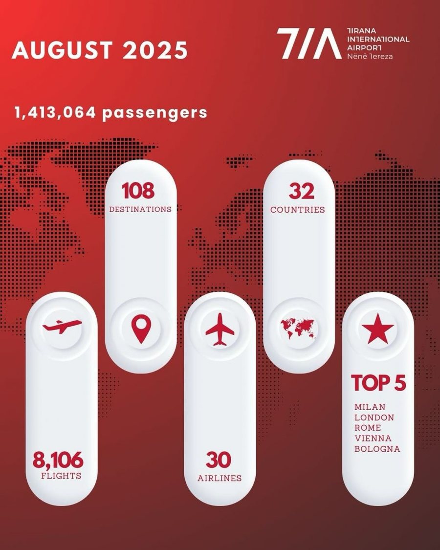 Aeroporti Ndërkombëtar i Tiranës regjistroi një rritje të ndjeshme të pasagjerëve gjatë sezonit veror 2025, duke arritur një rekord në muajin gusht me 1 413 064 pasagjerë dhe 8106 fluturime drejt 108 destinacioneve në 32 shtete. Sipas TIA-s, kjo rritje lidhet si me fluksin turistik, ashtu edhe me zgjerimin e lidhjeve ajrore.