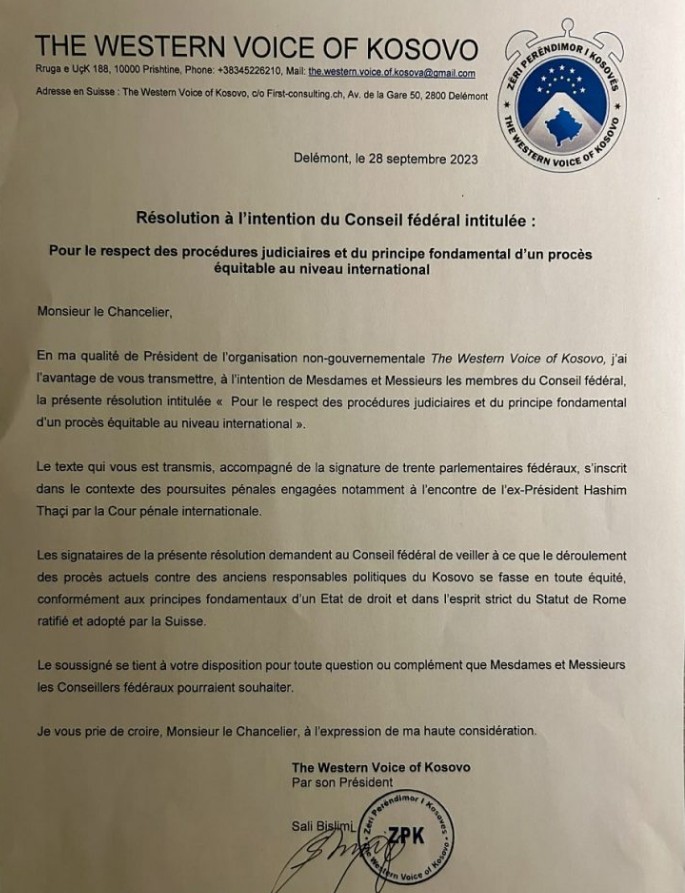 Rezoluta do të dorëzohet nga veprimtari Sali Bislimi në Gjykatën Speciale i cili tre vjet më parë i është adresuar Qeverisë zvicerane.