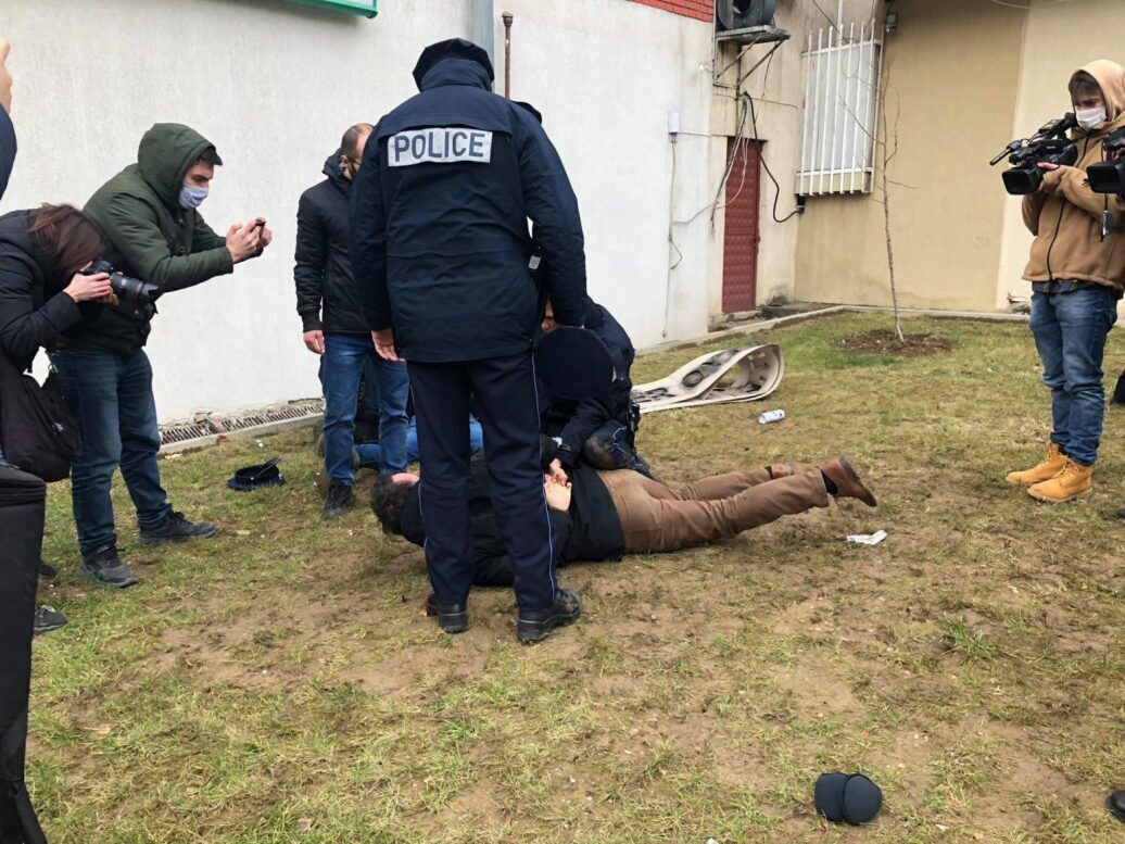 Përfaqësues të Partisë Socialdemokrate protestuan para stacionit të Policisë së Kosovës në qendër, duke shkruar në murin e këtij objekti “Për partitë tubime, për qytetarët dënime”. Policia mbërriti menjëherë në vendngjarje aty ku bëri disa arrestime e një prej tyre ishte dhe Molliqaj. Gjashtë efektivë e kanë shtrirë në tokë politikanin dhe po e prangosin.