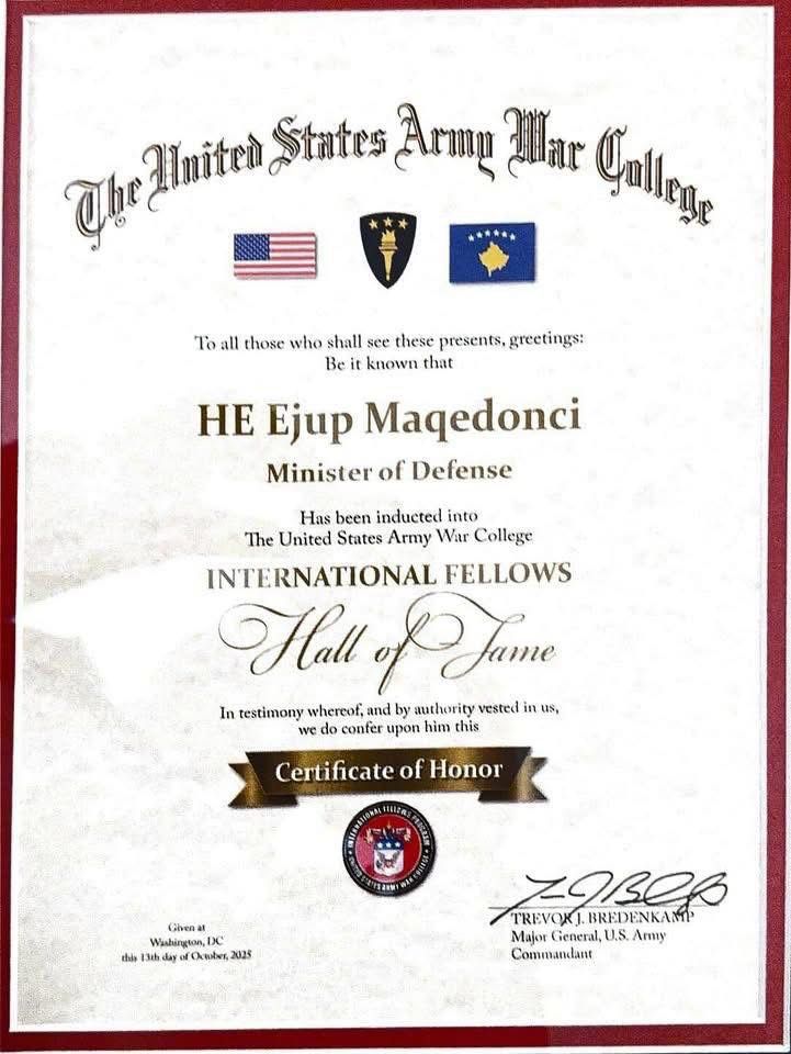 Një arritje historike dhe një nder i jashtëzakonshëm për shtetin e Kosovës dhe gjithë kombin shqiptar. Ministri i Mbrojtjes së Kosovës, Gjeneral Ejup Maqedonci, është përfshirë në “Hall of Fame” të U.S. Army War College, duke u bërë kështu gjenerali i parë shqiptar që merr këtë vlerësim të lartë nga një prej institucioneve më prestigjioze ushtarake në botë. Ky është një nga nderimet më të mëdha që Kolegji Ushtarak i Luftës i Ushtrisë Amerikane i jep personaliteteve ndërkombëtare që kanë dhënë kontribute të shquara në fushën e mbrojtjes, sigurisë dhe udhëheqjes strategjike.