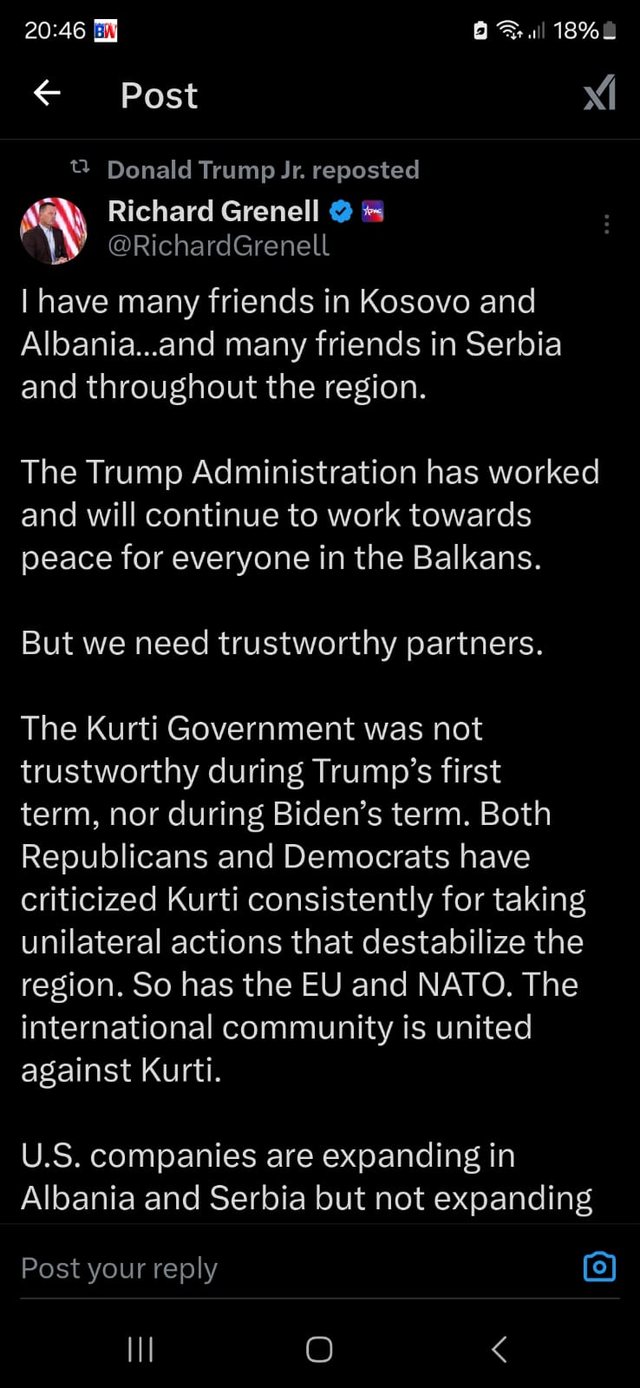 ”Bashkësia ndërkombëtare është e bashkuar kundër Kurtit”, shkroi Grenell në X. Këtë postim e ka ripostuar edhe djali i Donald Trump, Donald Trump.jr.