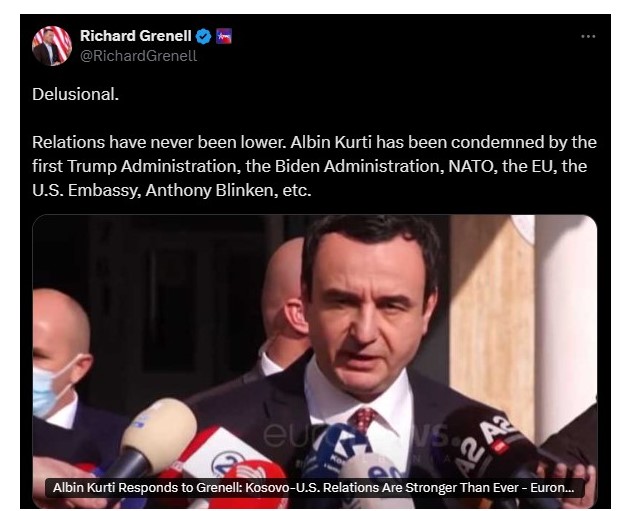 “Marrëdhëniet nuk kanë qenë kurrë më të ulëta. Albin Kurti është dënuar nga administrata e parë Trump, administrata e Bidenit, NATO, BE, ambasada e SHBA-së, Anthony Blinken etj”, ka qenë kjo kundërpërgjigjja e ish-emisarit të Shteteve të Bashkuara Richard Grenell ndaj kryeministrit të Kosovës Albin Kurti.