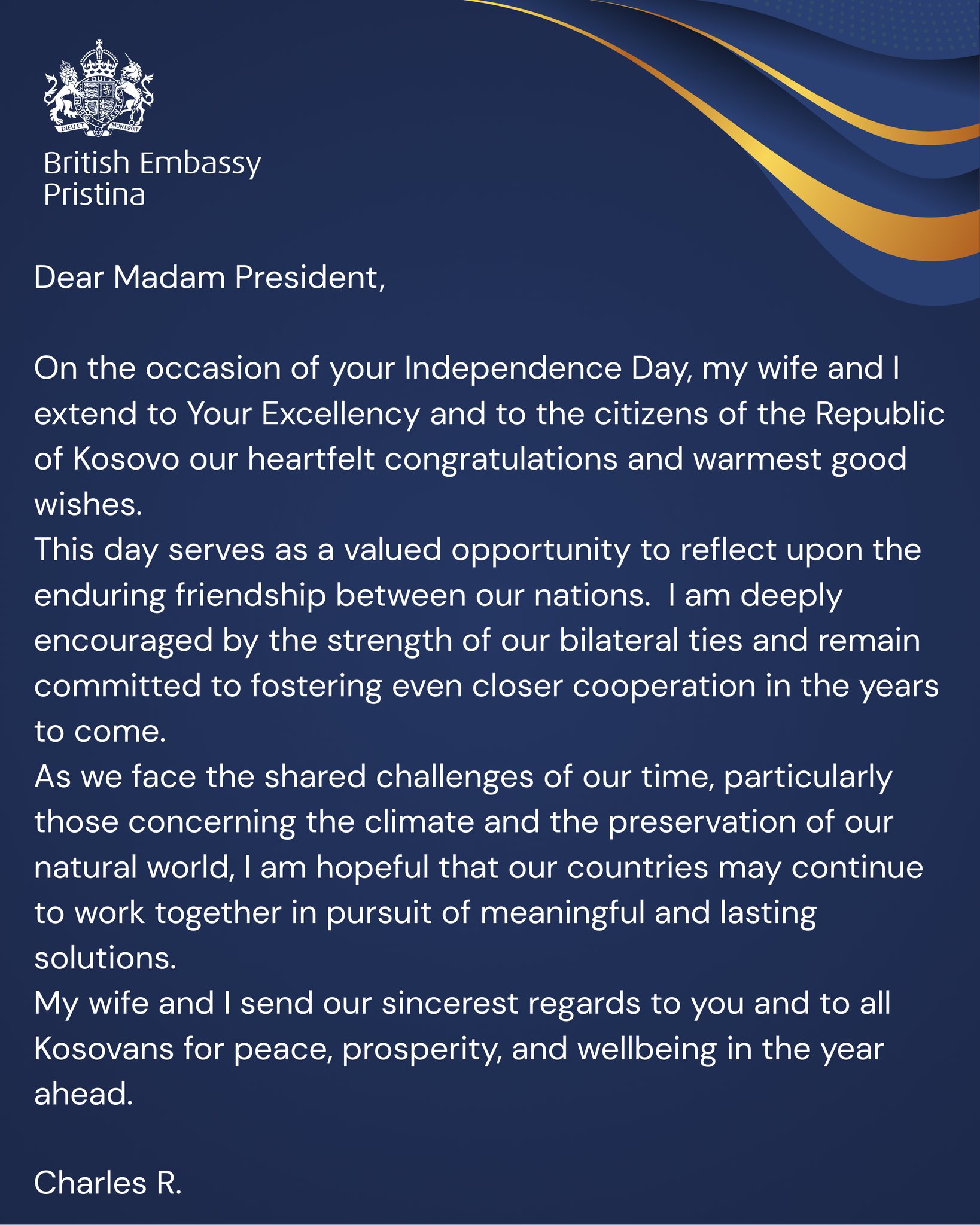 Ndërsa përballemi me sfidat e përbashkëta të kohës sonë, veçanërisht ato që lidhen me klimën dhe ruajtjen e botës sonë natyrore, shpresoj që vendet tona të vazhdojnë të punojnë së bashku për zgjidhje domethënëse dhe të qëndrueshme”, thuhet në letrën e Mbretit Charles III, e cila është publikuar nga Ambasada Britanike në Kosovë.
