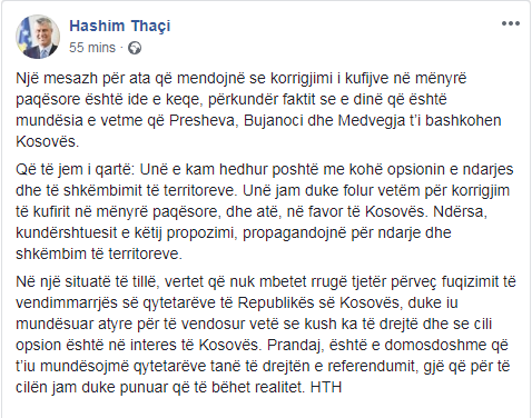Që të jem i qartë: Unë e kam hedhur poshtë me kohë opsionin e ndarjes dhe të shkëmbimit të territoreve. Unë jam duke folur vetëm për korrigjim të kufirit në mënyrë paqësore, dhe atë, në favor të Kosovës. Ndërsa, kundërshtuesit e këtij propozimi, propagandojnë për ndarje dhe shkëmbim të territoreve”, shprehet Thaçi.