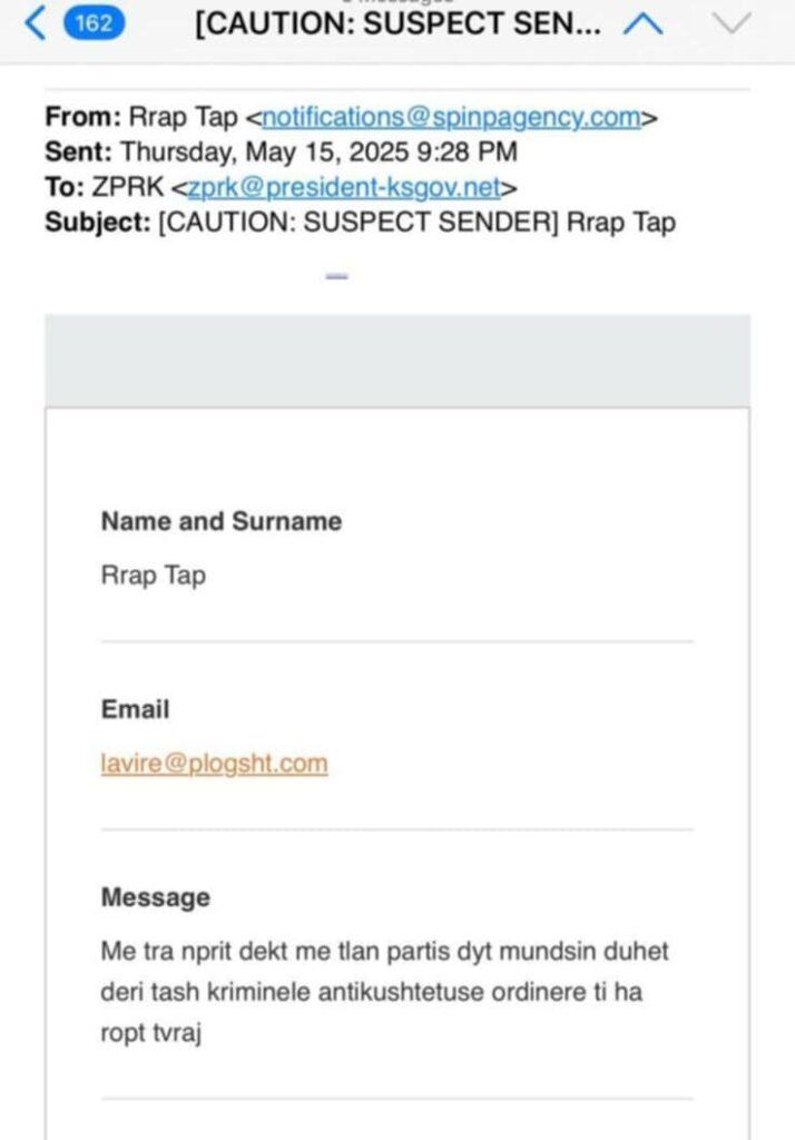Presidentja e Kosovës, Vjosa Osmani është kërcënuar me jetë përmes një e-mail. Rastin e ka konfirmuar këshilltari për media i Presidencës, Bekim Kupina. Në përmbajtjen e e-mailit, mund të shihet përmbajtja e mesazhit kërcënues, që i është drejtuar presidentes Osmani. Deri tani, nuk ka detaje shtesë për autorin apo autorët e mundshëm të këtij akti. “Me tra nprit dekt me tlan partis dyt mundsin duhet deri tash kriminele antikushtetuese ordinere ti ha ropt tvraj”, shkruhet në mesazhin kërcënues.