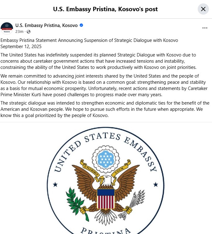 Shtetet e Bashkuara kanë pezulluar për një kohë të pacaktuar Dialogun e tyre Strategjik të planifikuar me Kosovën për shkak të shqetësimeve në lidhje me veprimet e qeverisë së përkohshme që kanë rritur tensionet dhe paqëndrueshmërinë, duke kufizuar aftësinë e Shteteve të Bashkuara për të punuar në mënyrë produktive me Kosovën mbi prioritetet e përbashkëta.