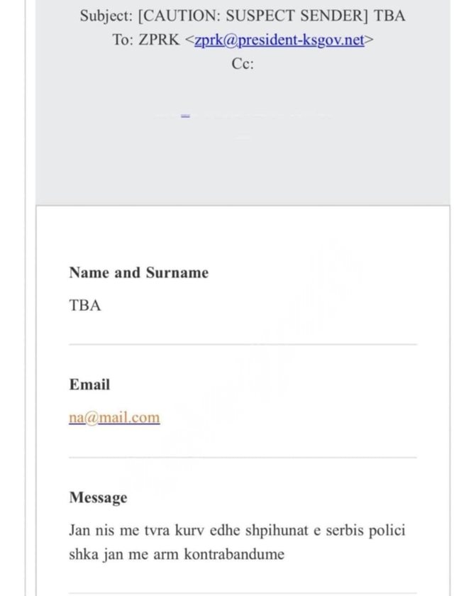 Presidentja e Kosovës, Vjosa Osmani është duke u përballur me kërcënime të vazhdueshme për jetën dhe sigurinë e saj personale. Një tjetër email kërcënues ka ardhur në emailin zyrtar të Presidencës së Kosovës. ”Janë nis me të vra k*** edhe shpijunat e Serbisë, polici çka janë me armë kontrabandume”, thuhet në emailin kërcënues.