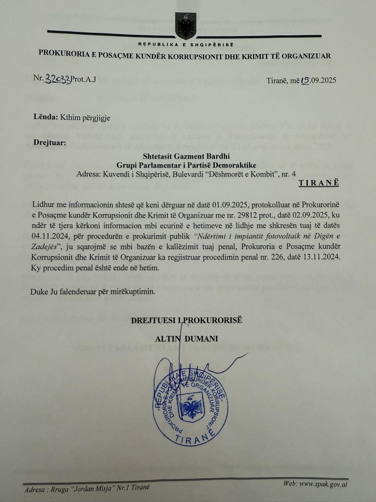 Kryetari i grupit parlamentar i PD, Gazment Bardhi tha sot se impianti fotovoltaik në digën e Zadejës është një aferë korruptive dhe se Prokuroria e Posaçme Kundër Korrupsionit dhe Krimit të Organizuar (SPAK) ka nisur zyrtarisht hetimet në lidhje me këtë aferë.