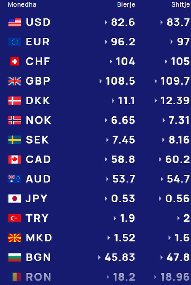 Për kursin e monedhave të tjera shihni tabelën e mëposhtme: