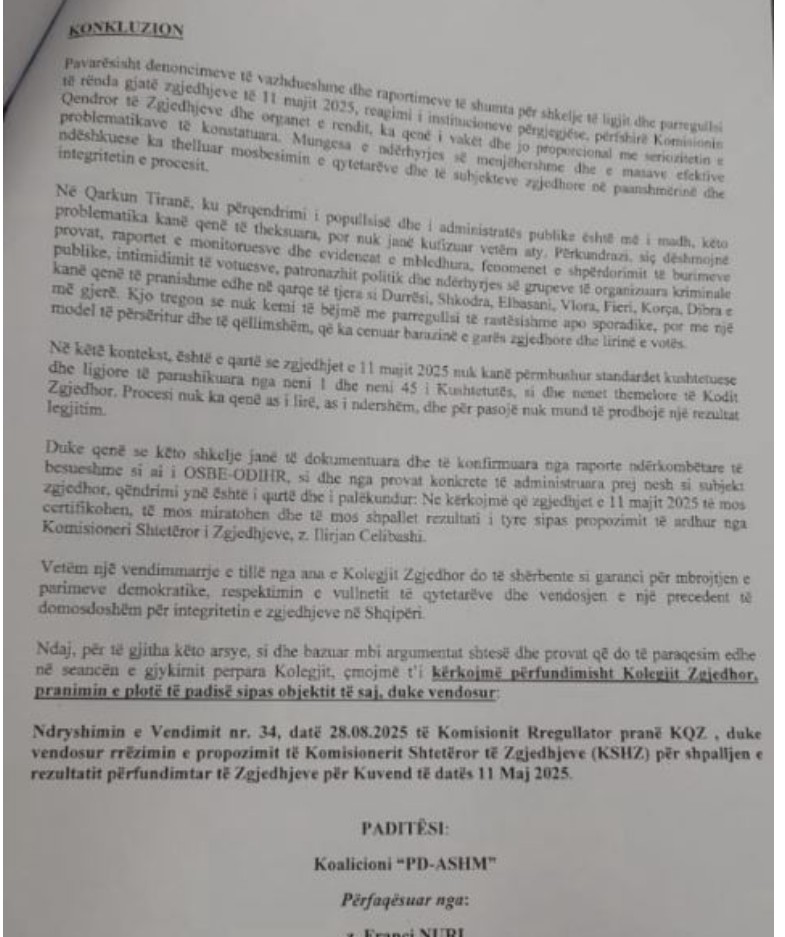 Partia Demokratike ka depozituar në Kolegjin Zgjedhor padinë kundër vendimit të Komisionit Rregullator që certifikoi përfundimisht 11 majin më 28 gusht që shpallën Edi Ramën fitues të 83 mandateve.