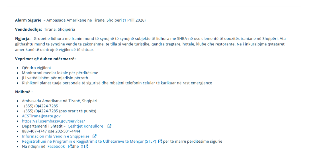 Ambasada e Shteteve të Bashkuara në Tiranë ka lëshuar një njoftim paralajmërues, duke informuar se grupe të lidhura me Iranin mund të shënjestrojnë subjekte të lidhura me Shtetet e Bashkuara, si dhe elementë të opozitës iraniane që ndodhen në Shqipëri.