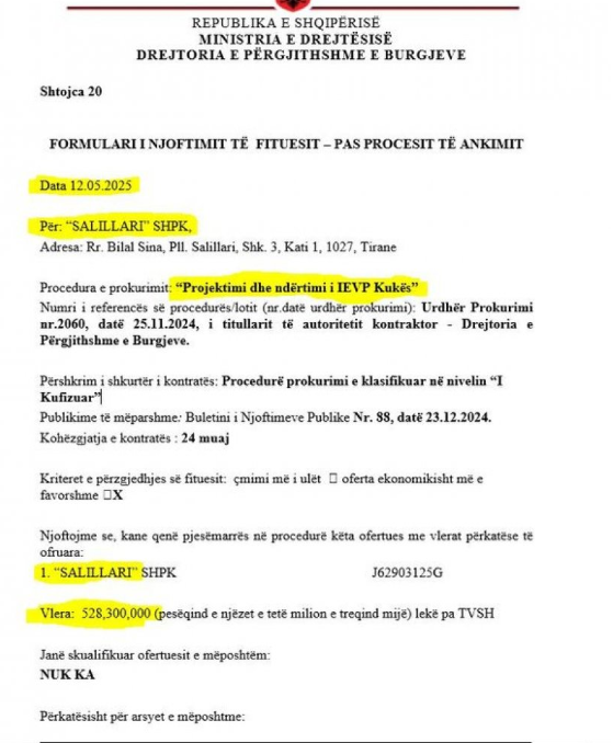 Më 12 maj 2025, vetëm një ditë pas zgjedhjeve parlamentare, Drejtoria e Përgjithshme e Burgjeve shpalli fituesin e një tenderi të majmë prej 528.3 milionë lekësh pa TVSH – rreth 5.3 milionë euro me TVSH – për projektimin dhe ndërtimin e IEVP Kukës.