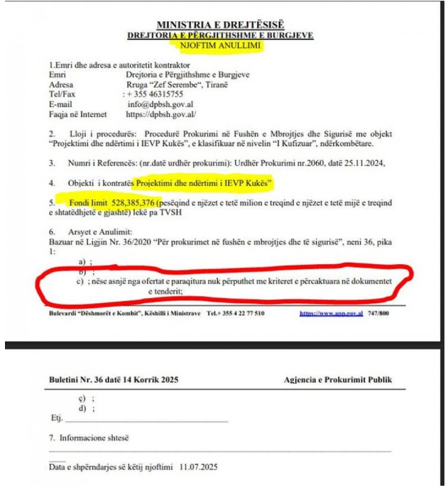 Në vend që të nënshkruhej kontrata, më 14 korrik 2025 Drejtoria e Burgjeve anulon tenderin, duke deklaruar se “asnjë ofertë nuk përmbushte kriteret”. Por si mund të shpallet fitues një operator që më pas rezulton i papërshtatshëm? Ku qëndron përgjegjësia për vlerësimin paraprak dhe për shpalljen e fituesit?