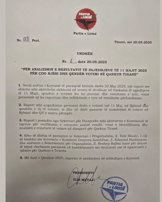 Ja se çfarë ka firmosur nga burgu Ilir Meta: “Firmosa sot urdhrin për analizimin e rezultatit të zgjedhjeve të 11 Majit për çdo Njësi dhe Qendër Votimi në Qarkun Tiranë për të verifikuar punën dhe rolin e gjithsecilit….”.