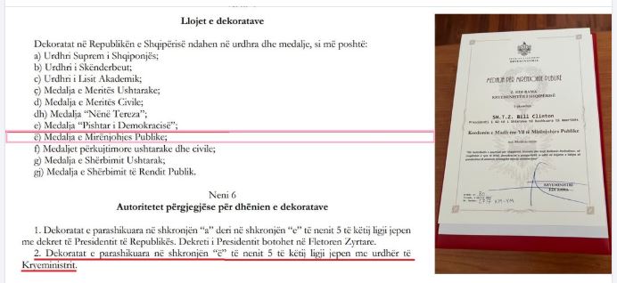 Tabela paraqet listën e dekoratave në RSH, – siç shihet, 7 të parat jepen nga Presidenti, kompetencë kushtetuese që është hequr, – duke ia kaluar de facto një strukture të re të ngritur në kryeministri, “Kancelaria e Urdhrave dhe Medaljeve”. I vetmi vend europian që ka krijuar këtë model. Ligji i ri parashikon se dekorata/medalja e renditur në vendin e 8-të është kompetencë e kryeministrit! Dhe në thelb ligji është bërë vetëm për këtë, për të krijuar akses që kryeministri të jap medalje. Dhe kryeministri aktual po e shijon, – sot i dha një rektori, para pak ditësh ish kryeministrit, dhe kështu me rrallë ua ka dhënë disa gjeneralëve, ambasadorëve, sportistëve, etj. Çështje marrëdhëniesh publike dhe preferencash. Ligji nuk e detyron të konsultohet me askënd, përveç stafin e tij ministror.