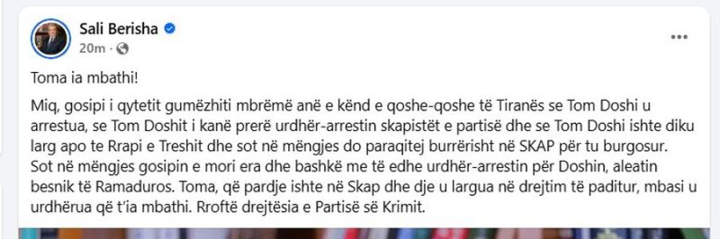 Kreu i PD-së, Sali Berisha lëshoi një akuzë të fortë, që sipas tij kreu i PSD-së Tom Doshi është larguar në përpjekje për t’i shpëtuar një urdhër-arresti nga SPAK. Në një postim në Facebook që më pas Berisha e fshiu, shkruante që pas paraqitjes në Prokurorinë e Posaçme pak ditë më parë, Tom Doshi sipas tij është urdhëruar që t’ia mbathë.