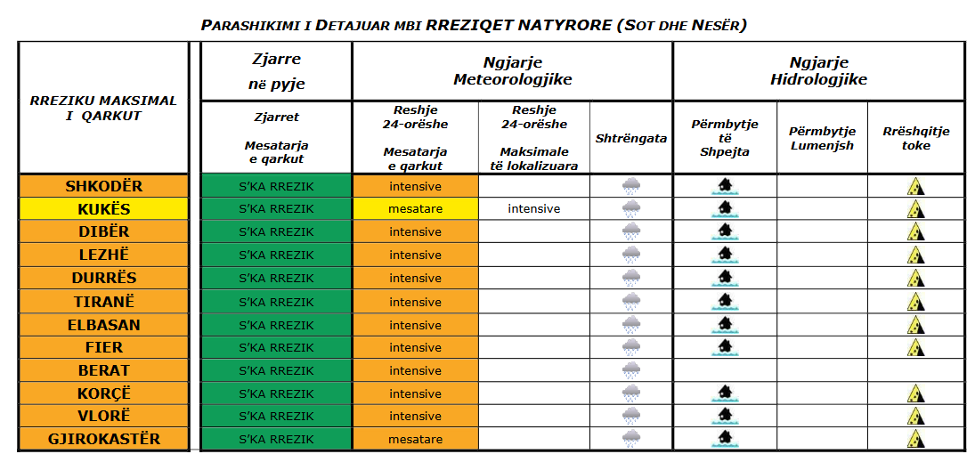 Sot (e enjte, dt. 08) në qarqet Shkodër, Dibër, Lezhë, Durrës, Tiranë, Elbasan, Fier, Berat, Korçë, Vlorë dhe Gjirokastër priten reshje intensive, ndërsa në qarkun Kukës priten reshje mesatare deri lokalisht intensive. Reshjet priten të shoqërohen me shtrëngata (siç tregohet në tabelë, respektivisht për secilin qark).