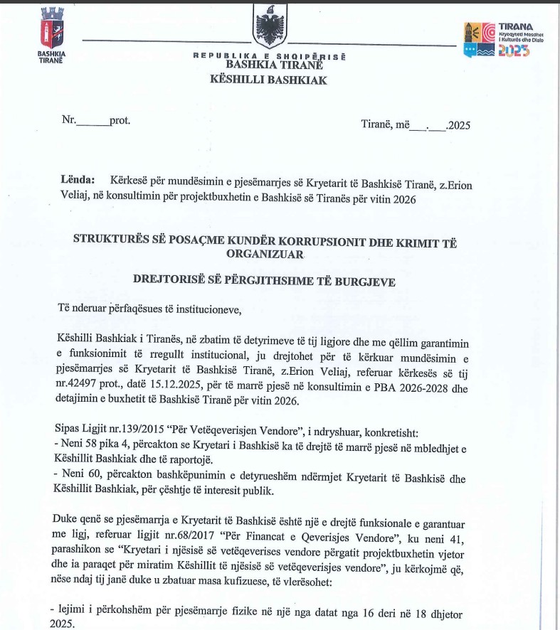 Këshilli Bashkiak i Tiranës, në zbatim të detyrimeve të tij ligjore dhe me qëllim garantimin e funksionimit të rregullt institucional, ju drejtohet për të kërkuar mundësimin e pjesëmarrjes së Kryetarit të Bashkisë Tiranë, z. Erion Veliaj, referuar kërkesës së tij nr.42497 prot., datë 15.12.2025, për të marrë pjesë në konsultimin e PBA 2026-2028 dhe detajimin e buxhetit të Bashkisë Tiranë për vitin 2026.