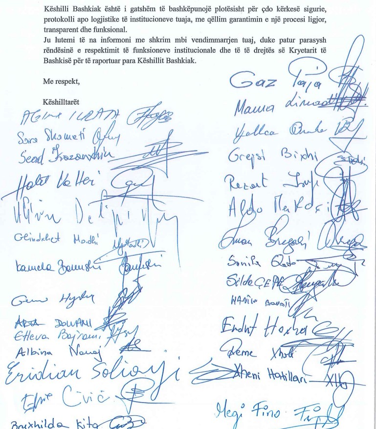 Këshilli Bashkiak është i gatshëm të bashkëpunojë plotësisht për cdo kërkesë sigurie, protokolli apo logjistike të institucioneve tuaja, me qëllim garantimin e një procesi ligjor, transparent dhe funksional.