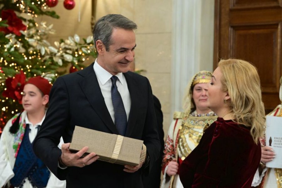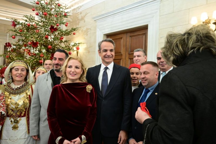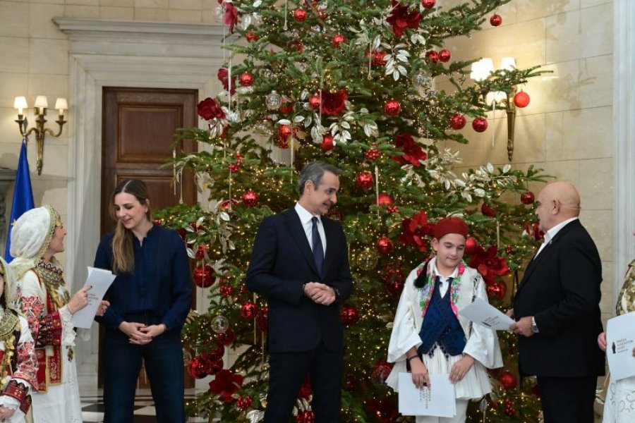 Kryeministri grek Kyriakos Mitsotakis mirëpriti grupin e këngëtarëve tradicionalë arvanitas në Pallati Maximos, duke vijuar një nga traditat festive të Vitit të Ri, në një atmosferë të ngrohtë dhe simbolike.