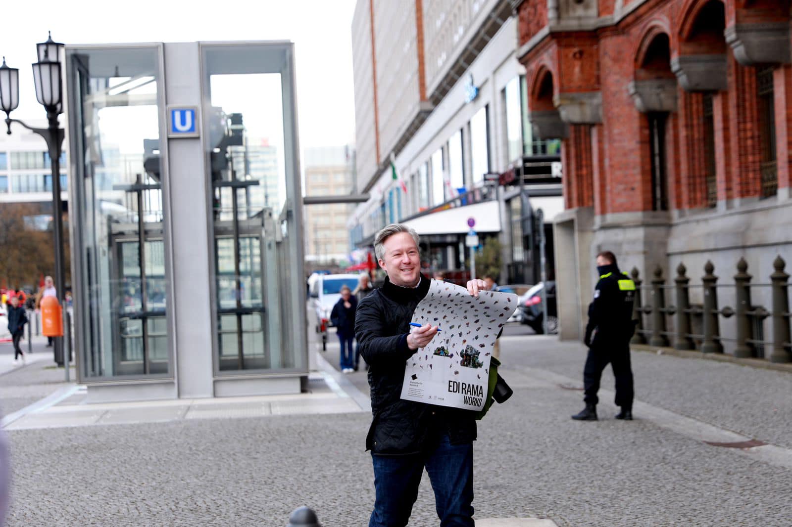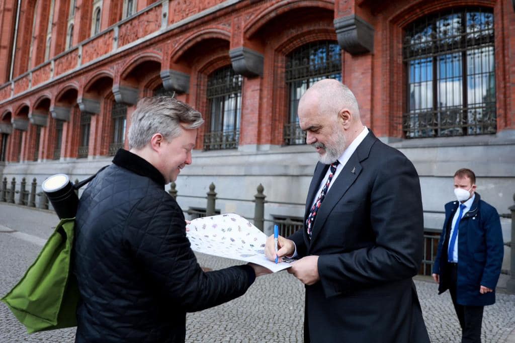 Në momentin kur po dilte një gjerman e ka thirr me emër kryeministrin e Shqipërisë. Dhe Edi Rama ka takuar simpatizantin e tij gjerman duke i dhënë një autograf.